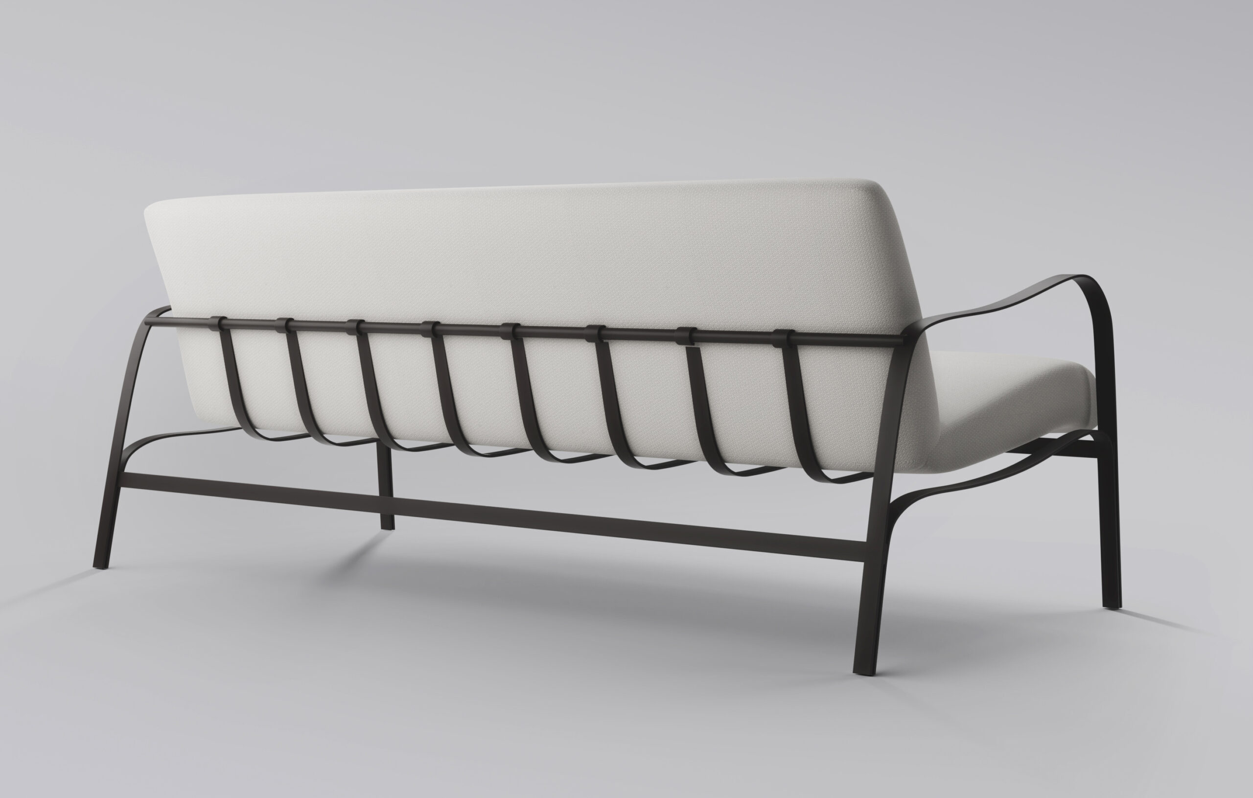 Divano in piatto di acciaio inox AISI 304 forgiato, cuscinerie fisse in tessuto Sunbrella Nattè Nature (NAT 10014 140), cover protettive incluse. Verniciato a polvere.