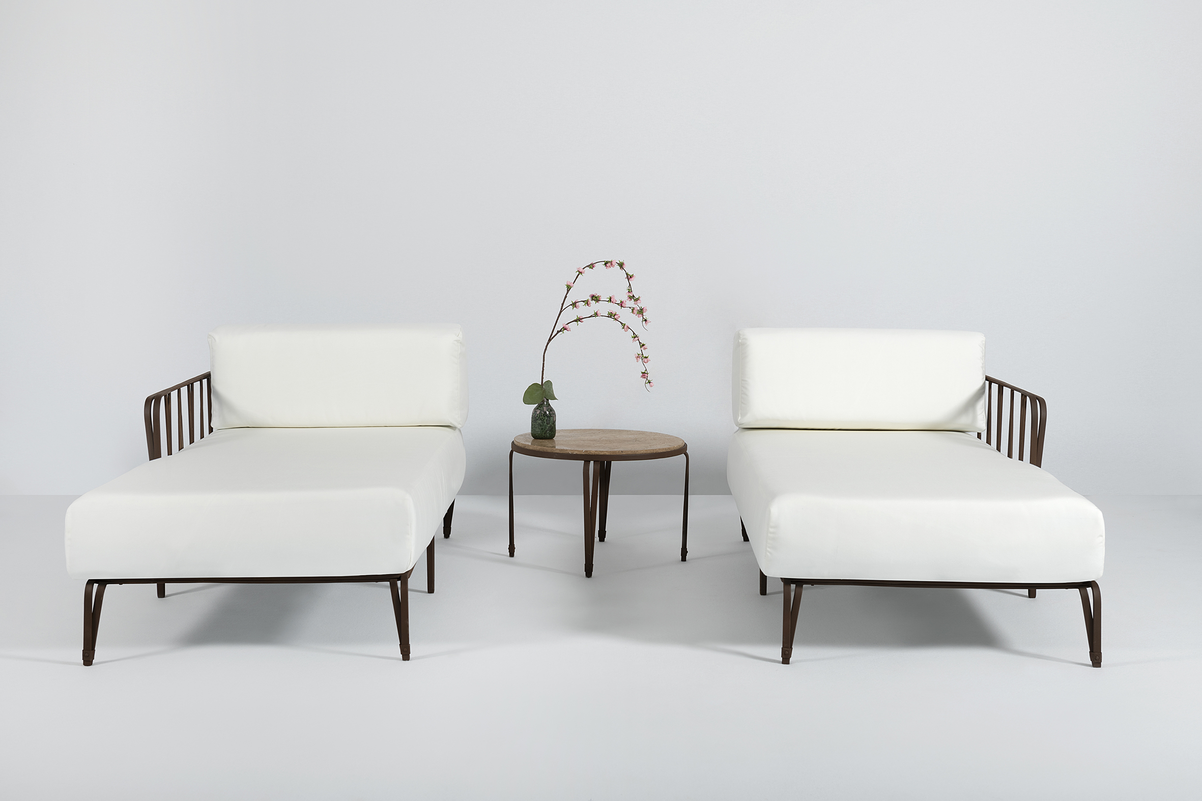 Chaise-longue in acciaio inox AISI 304 forgiato dalle linee semplici e senza tempo adatta ad arredare diversi tipi di spazi, disponibile anche con finiture da interno, nella versione da esterno verniciato a polvere, cuscinerie in tessuto Sunbrella Natté Col.Nature incluse.