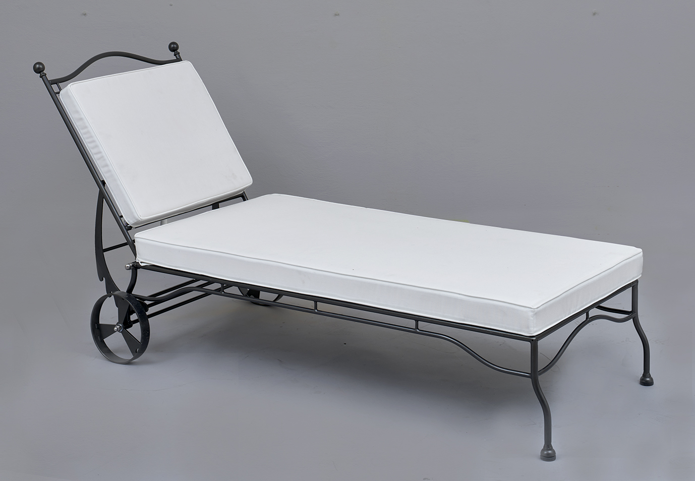 Lettino in acciaio inox AISI 304 forgiato con schienale regolabile e ruote, verniciato a polvere, cuscinerie in tessuto SUNBRELLA NATTE’ Col.Natural (bianco)