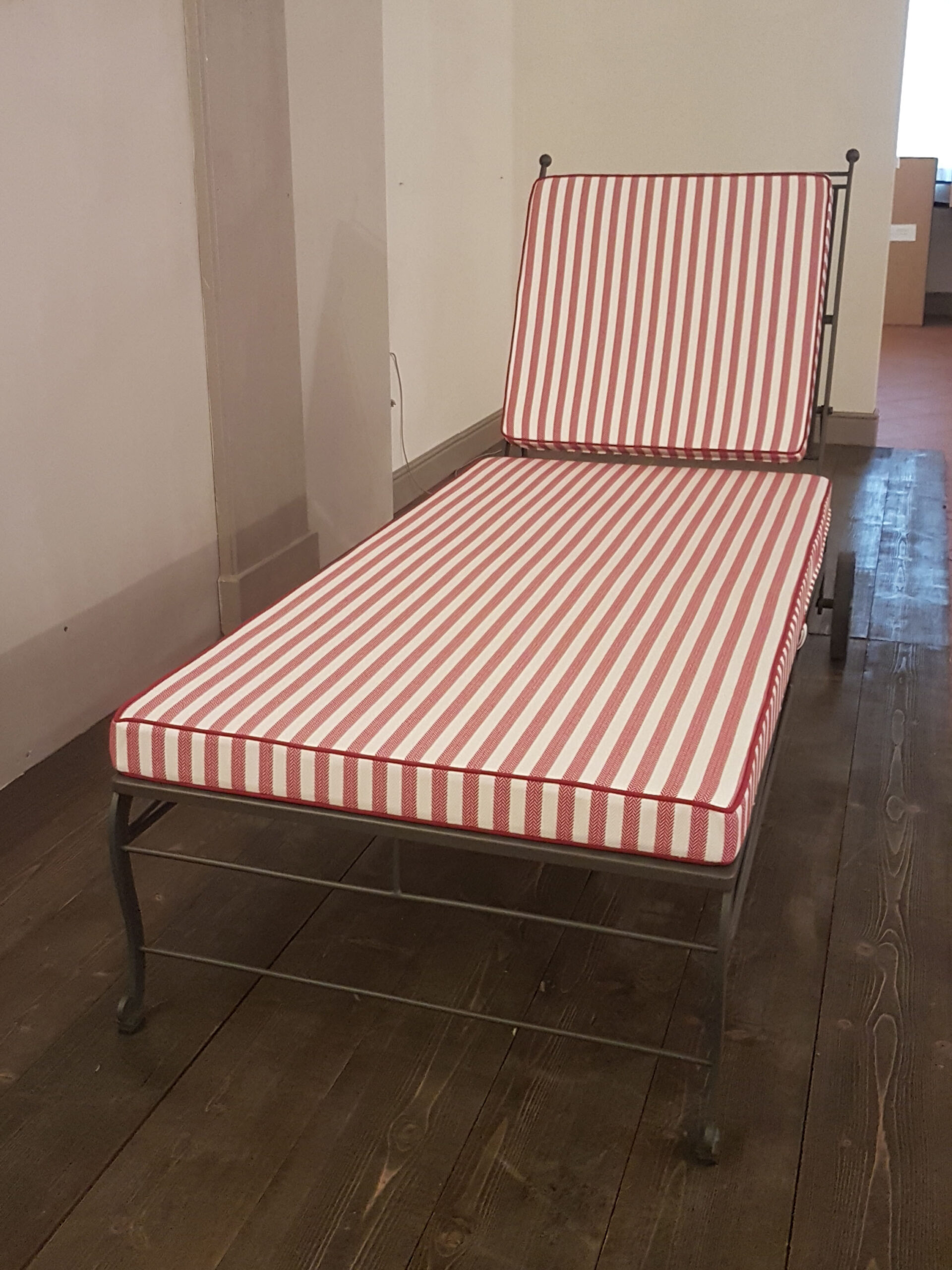 Lettino prendisole in acciaio inox AISI 304 con schienale regolabile, verniciato a polvere, cuscinerie in tessuto Sunbrella Natté Col.Natural (bianco).