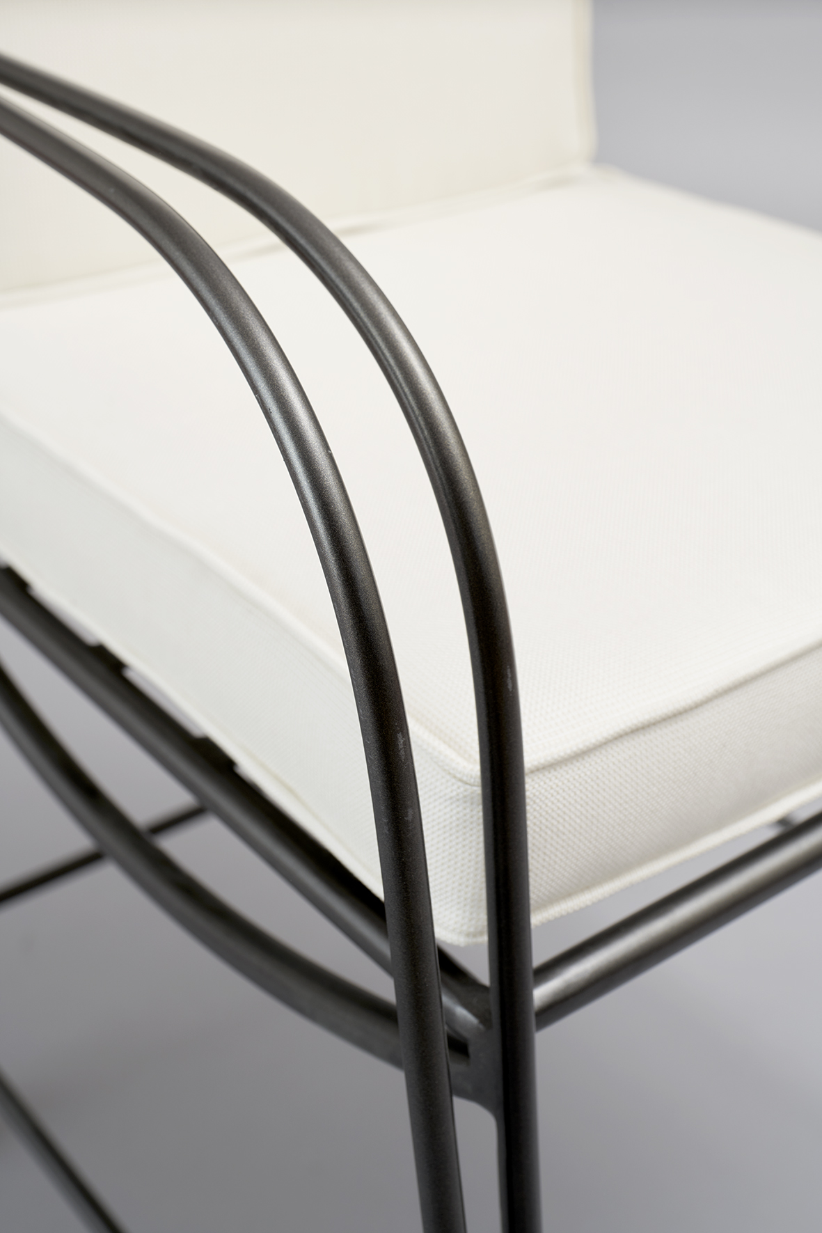Sedia in acciaio inox AISI 304 con braccioli, verniciato a polvere, cuscinerie in tessuto outdoor stoffa Sunbrella Nattè Nature (NAT 10014 140), verniciato a polvere.