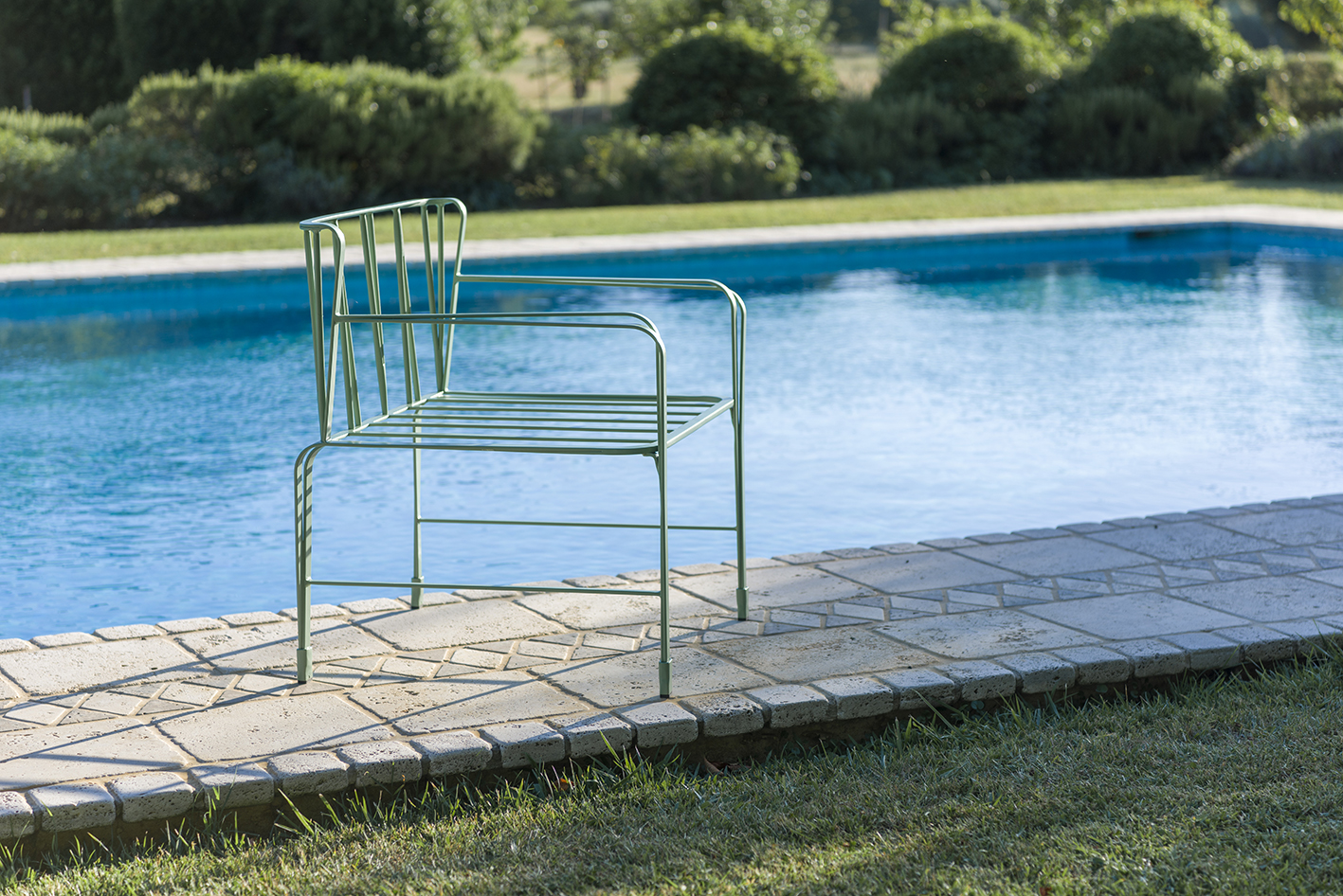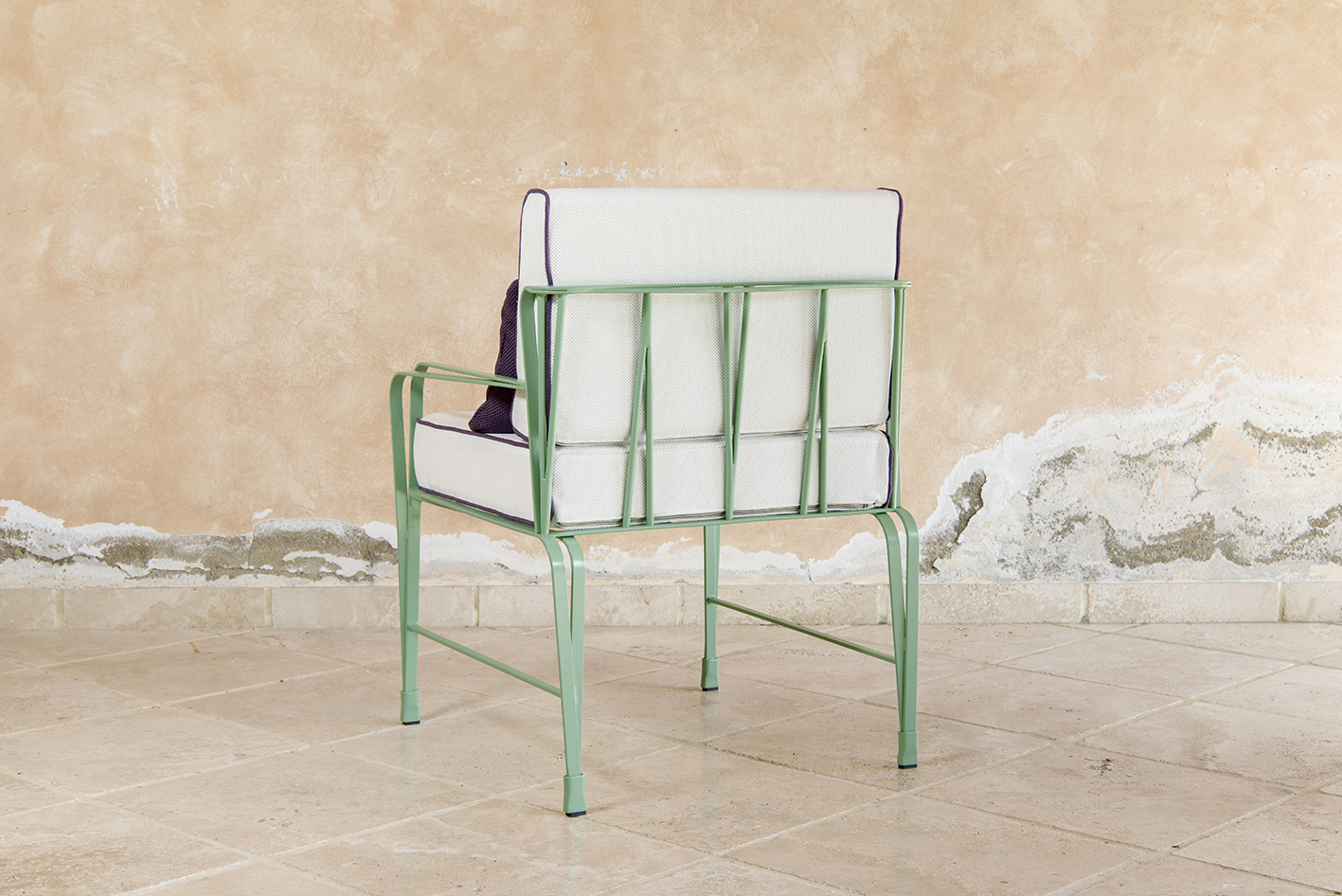 Sedia in acciaio inox AISI 304 forgiato con braccioli dalle linee semplici e senza tempo adatta ad arredare diversi tipi di spazi, disponibile anche con finiture da interno, nella versione da esterno verniciato a polvere, cuscinerie in tessuto Sunbrella Nattè Col.Nature incluse.