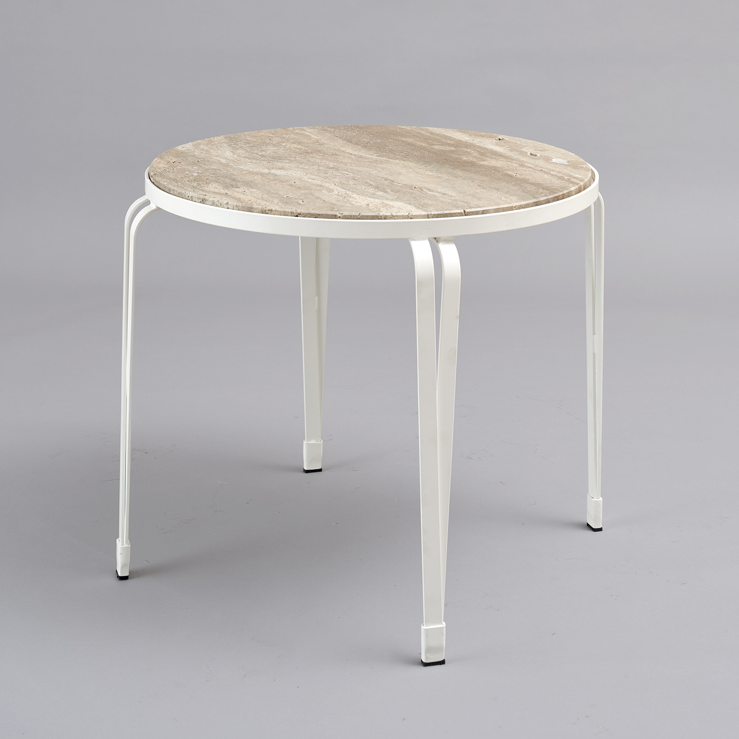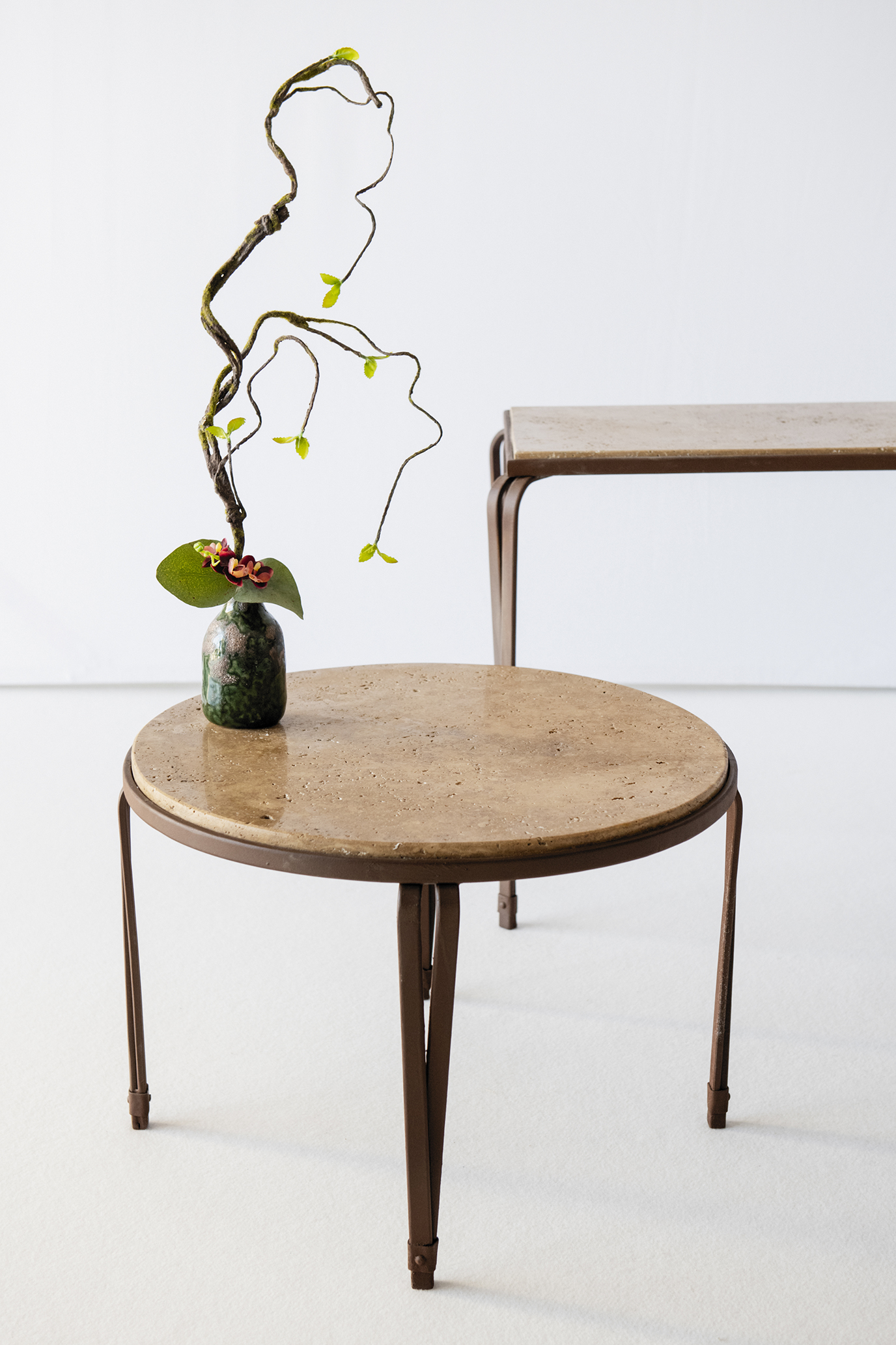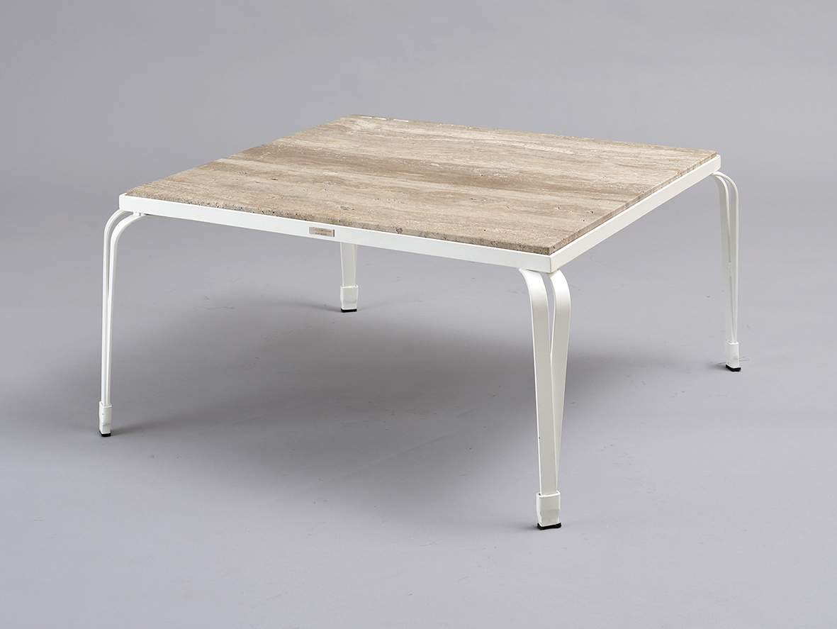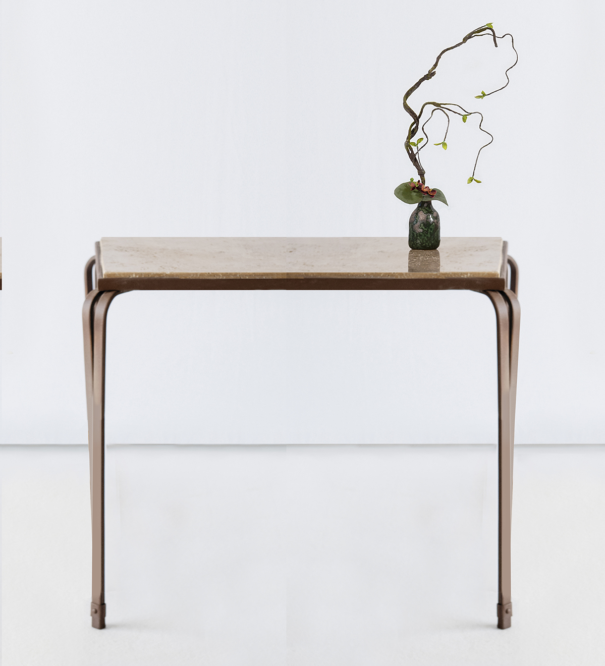 Tavolino basso e lato divano in acciaio inox AISI 304 forgiato dalle linee semplici e senza tempo adatta ad arredare diversi tipi di spazi, disponibile anche con finiture da interno, top in Travertino.