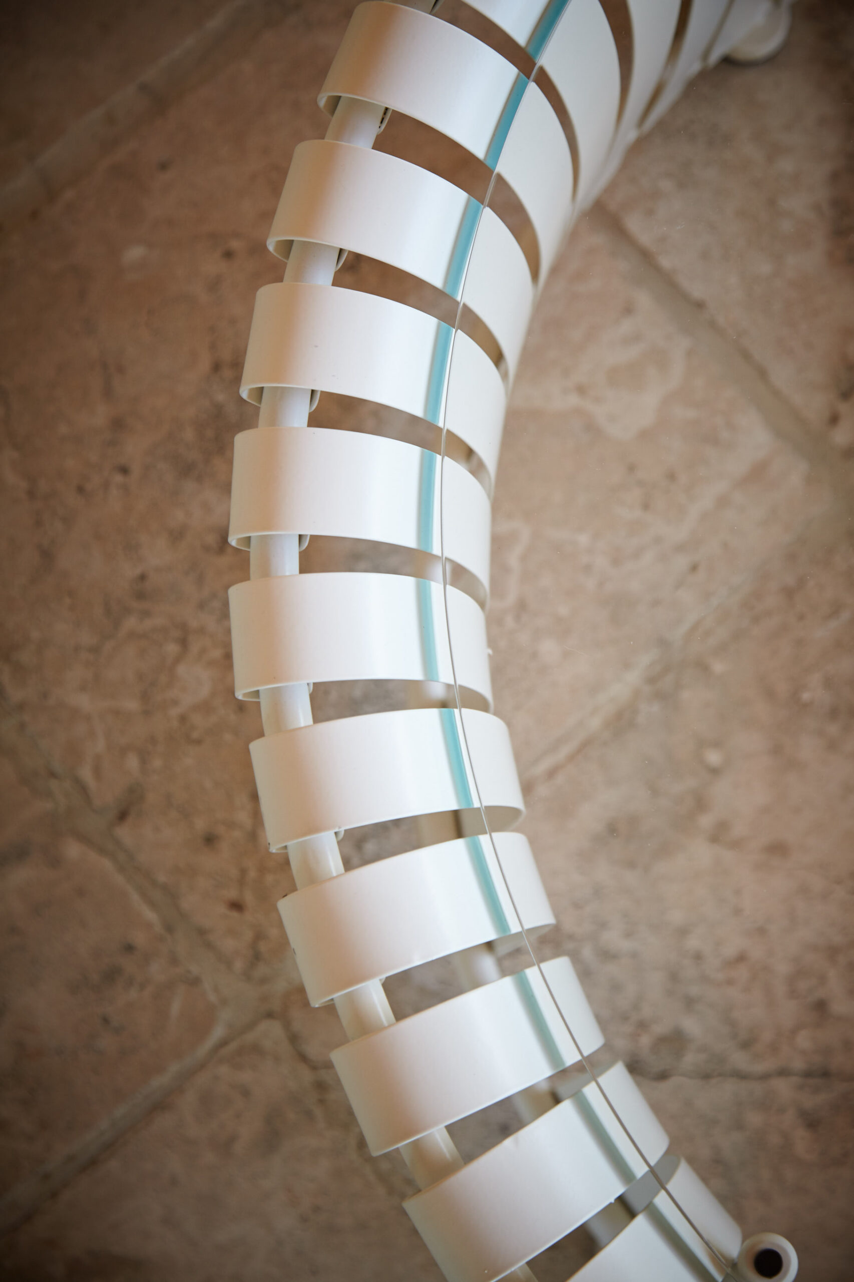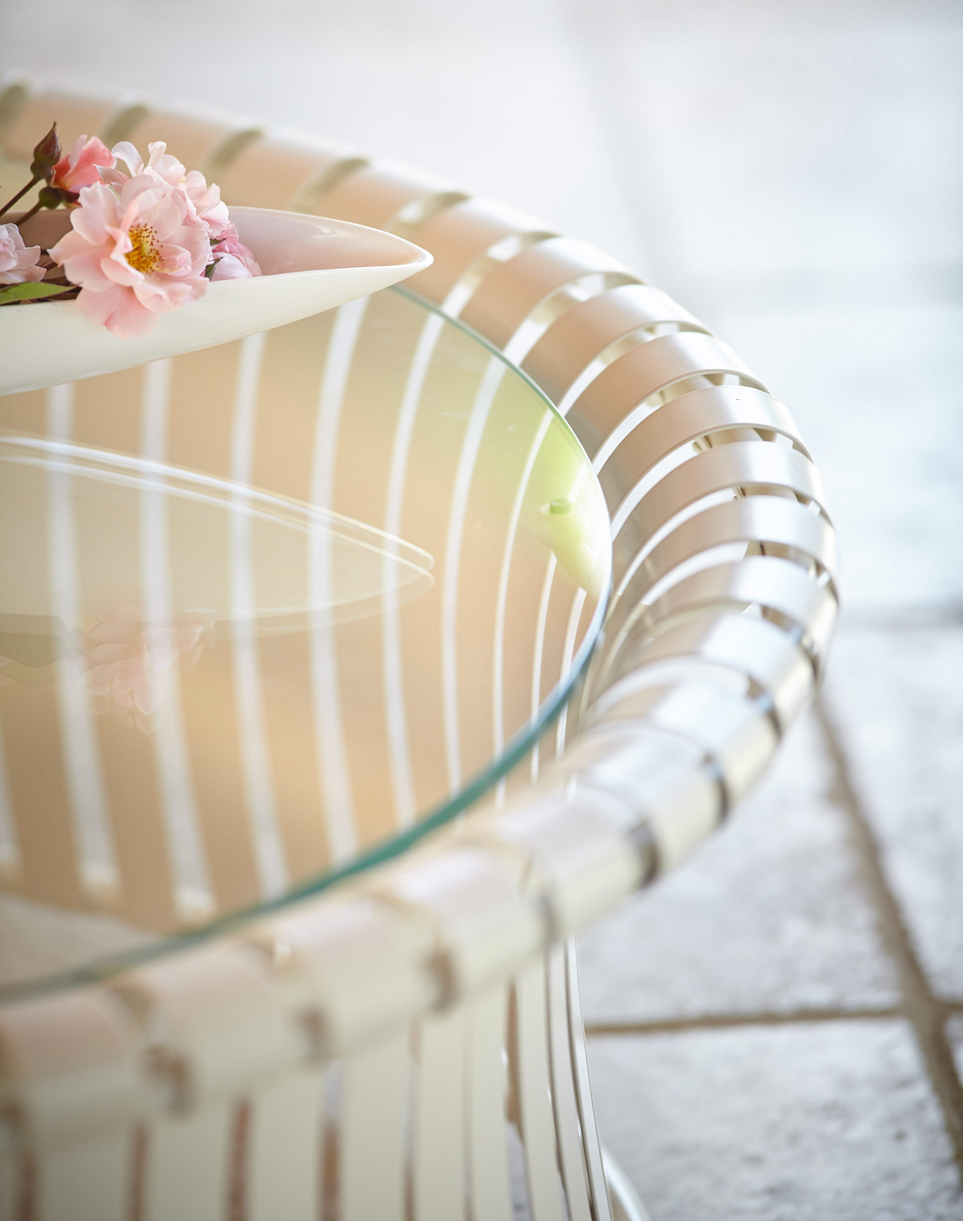 Tavolo basso in acciaio inox AISI 304 rotondo molle con piano cristallo, verniciato a polvere.