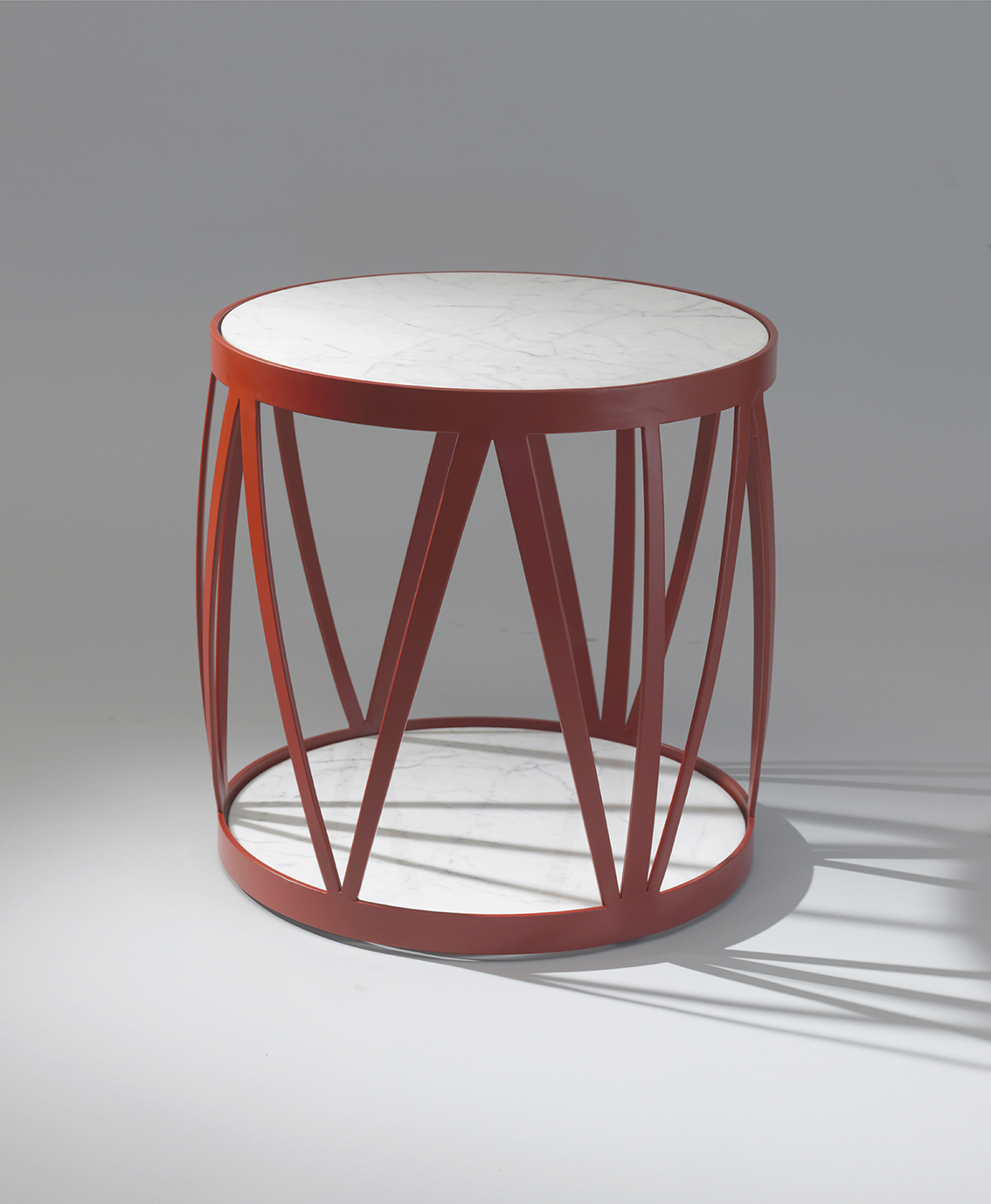 Tavolino caffè in acciaio inox AISI 304 con bacchette decorative, piano in marmo, verniciato a polvere.