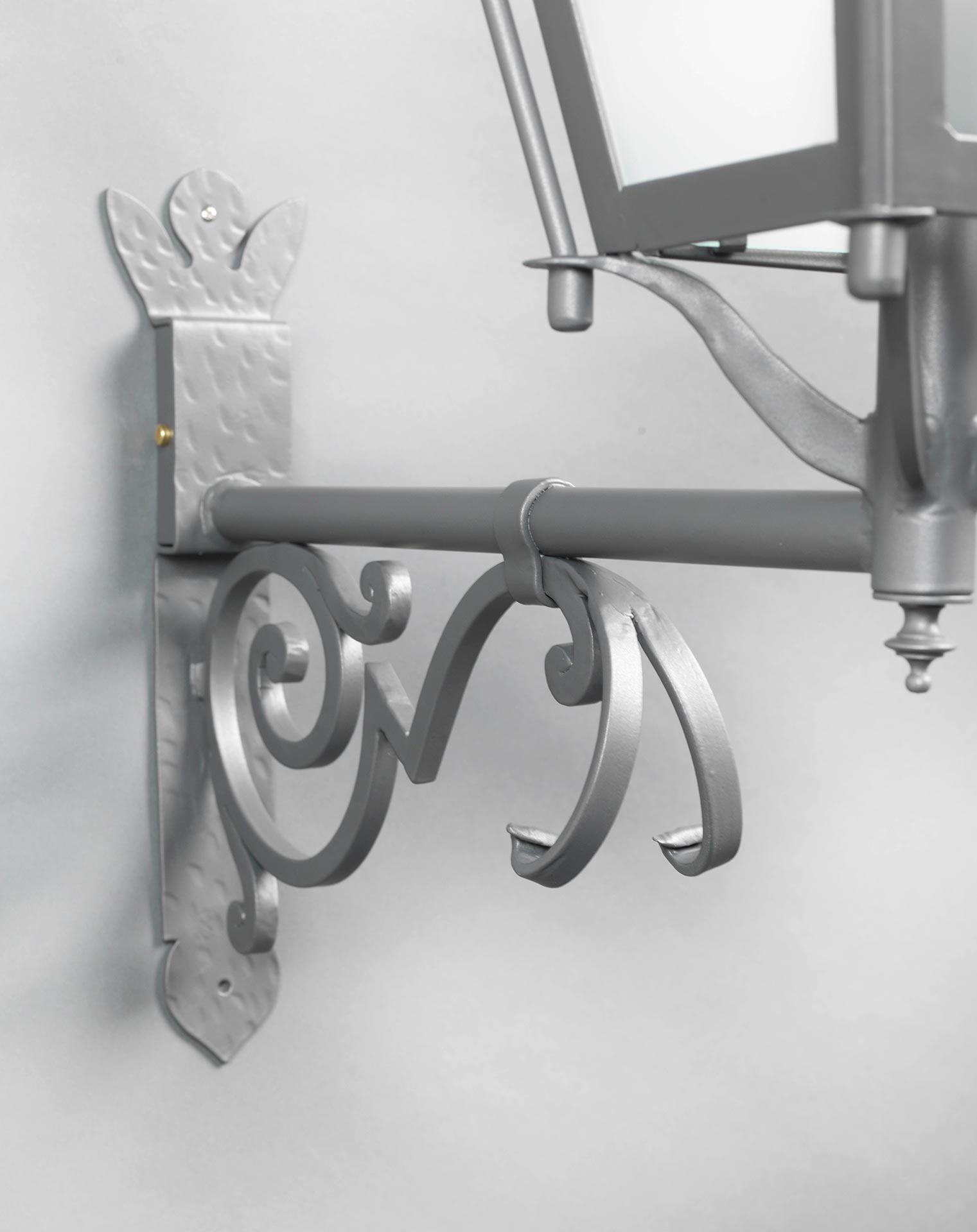 Lanterna a muro in ferro con vetri con braccio in alto, zincato e verniciato a polvere.