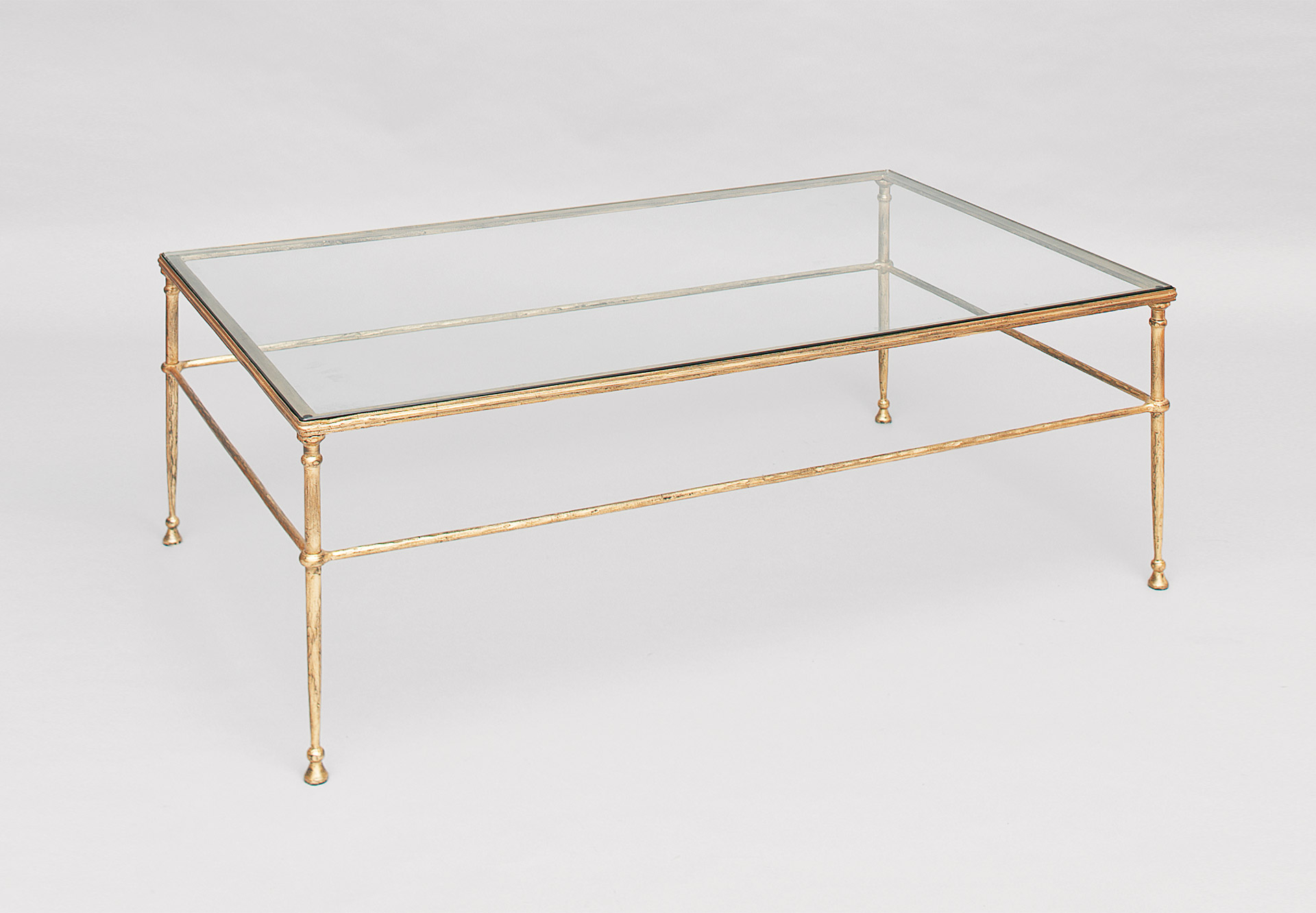 Tavolo in ferro rettangolare basso con top cristallo a incasso.