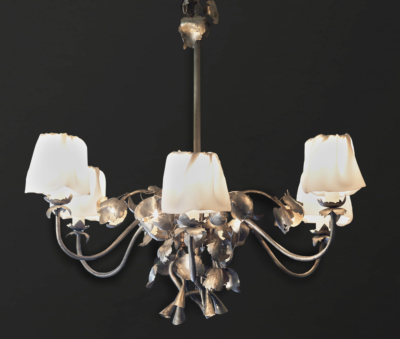 Lampadario con foglie in ferro forgiato e laminato a mano. Finitura in ferro naturale. Led nella parte bassa.