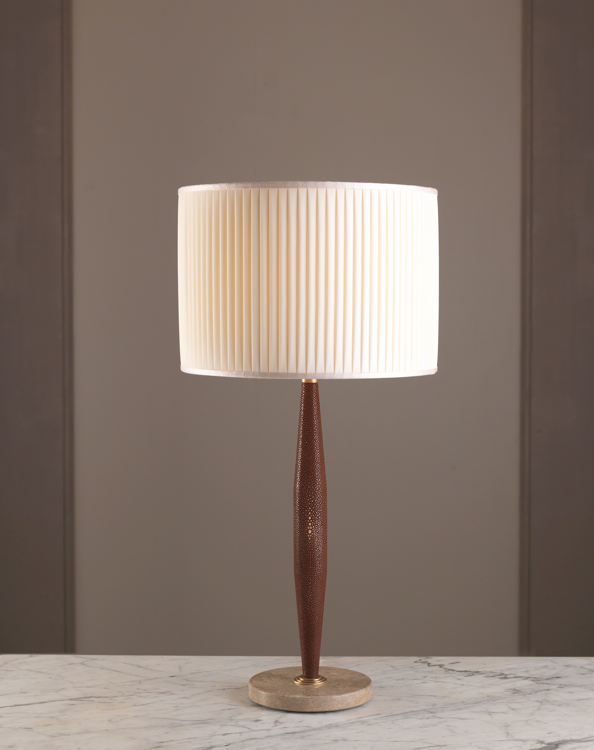 Lampada da tavolo con fusto rivestito in vera pelle di razza, base in marmo. Paralume incluso.